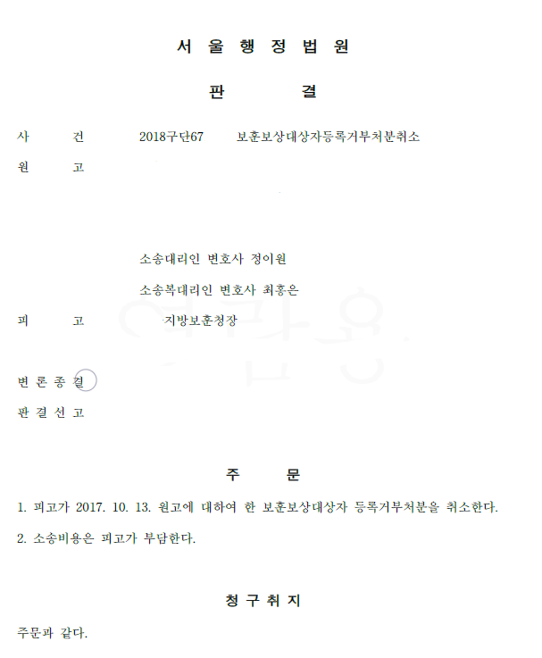 이에 신청인은 법원 소송을 통해 심부정맥혈전증이 군복무중 발병한 것은 아니라도 최소한 군복무 중 업무과다와 스트레스로 인하여 악화된 점은 인정된다고 하여 보훈보상대상자 등록 결정을 받게 되었습니다.